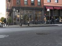 A view of the bustling metropolitan area of New York City, USA, featuring a low-profile automobile, classic architecture, tree-lined roads, and storefronts in a downtown neighborhood.