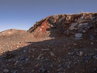 A scenic view of the rugged terrain and mountain landforms of Yunnan, China, with a clear sky overhead, illuminated by the sunlight. A road leads off into the leafy wilderness, winding its way through the brown soil and asphalt, past the rocky walls, igneous rock outcrops, gravel and fault lines, down into the wadi-like canyon and up to the elevated hilltops.