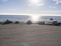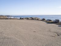 A day of exploration at Montaña de Oro State Park in California, USA. An aerial view of the beach, lake, mountain, and ocean, with a winding coastal highway and its craggy rock headlands, set against a clear blue sky. The natural environment and open space provides a great destination for recreational activities, vacation, and wilderness exploration.