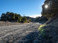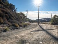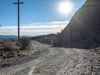 A rugged road winds its way through the California desert, offering spectacular views of the city skyline below. The clear sky is dotted with contrails and the warmth of the sun is visible, illuminating the path ahead.