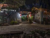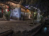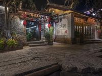 A residential street lined with cobble stone, trees, and old buildings in the old town of Lijiang, Yunnan, China. Here, the classic architecture of the village is a tourist attraction, with a combination of artificial light and city life creating a unique urban design. In the foreground, tourists can enjoy a variety of restaurants and cafe for a delicious experience of China's Shangri-La.