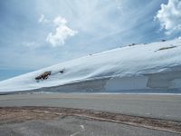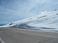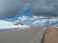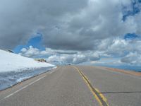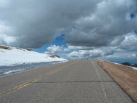 Located in Colorado, USA, the scenic road to Pikes Peak summit offers a breathtaking view of the snowy landscape. Clouds drift lazily overhead as asphalt roads lead straight down the road to the overlook. Nature's beauty is on full display, with one-quarter of the journey providing an overview of the picturesque surroundings. Visitors can marvel at the stunning landscape and enjoy the panoramic view from the summit.