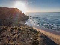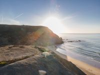 From a high position, Portugal's coastal landscape is a stunning blend of ocean and open space. The clear sky and visible sun highlight the dirt and gravel surfaces that meet the water's edge. Contrails streak across the sky, adding to the beauty of this European coastal gem. With sunny beaches and elevated views, the coastline offers a captivating aerial perspective of Portugal's natural charm.