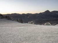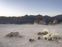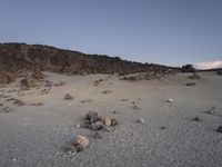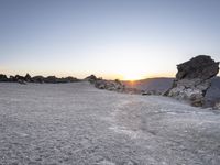 The sun rises over the rocky coastal landscape of Tenerife, Spain. The dirt road winds through the badlands towards the distant mountain range, creating a unique view of the natural environment, with the beach, sea, ocean, and wintery sky in the background.