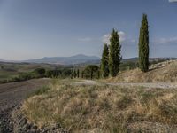 A dirt road, lined with cypress trees, leads through the rolling hills of Tuscany, Italy. A wild grass surface and low sand mountains create a unique landscape, while a clear sky and recreational sand street allow visitors to enjoy the natural environment.