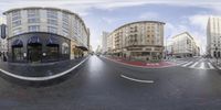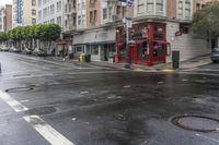 A wet road surface and classic architecture in the city of San Francisco invite visitors to explore the urban infrastructure and eat out at a local restaurant during the day.