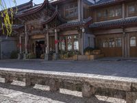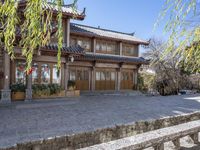 A view of the ancient Japanese architecture in the city of Lijiang, Yunnan, China. The cobblestone alley-way curves around the residential area, passing by storefronts and ancient temples, and leading to an elevated bridge crossing the creek, all beneath the clear autumn sky.