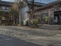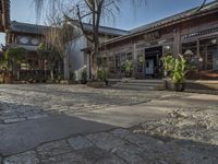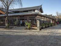 The break of day reveals a cafe, restaurant, and hotel along a cobble stone road in a classic Chinese and Japanese-influenced architecture of an old town in Lijiang, Yunnan, China. A neighborhood of residential area, old village, and open space, the historic architecture of the city provides a beautiful view of the spring season with a clear sky, grass, trees, and roof profile in the urban design.