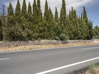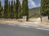 A view of a road surface in Mallorca, Spain, a part of the Balearic Islands in Europe. The asphalt lane is surrounded by grass, dirt, and gravel with shrubs and other vegetation. The clear sky above provides a beautiful backdrop to the peaceful landscape.