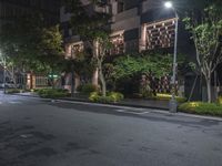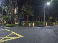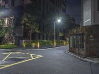 A nighttime view of the bustling streets of Taipei, Republic of China, featuring modern architecture, urban design, and a variety of vegetation, including trees and shrubs. Artificial lights, traffic lights, and street lights illuminate the asphalt road surface and the grassy curb, while yellow tints and shades of black, green, and gray provide a unique contrast to the colorful landscape.