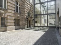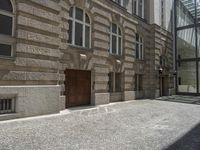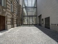 The yellow door of a building in the business district of Berlin, Germany stands out amongst the classic architecture of the European city. Cobble stone walkways, stone walls, and asphalt road surfaces make up the infrastructure of the neighborhood, highlighting the urban design of the town.