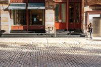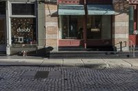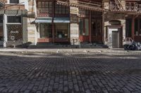 A classic example of urban architecture in New York City, USA. An alley-way lined with cobble stone, a motor vehicle parked at the curb, and a variety of storefronts and restaurants. A dove sits atop a domed building, and a tree casts a hard shadow on the asphalt road surface.