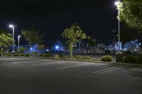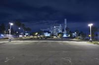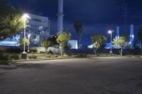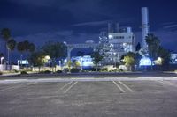 A profile view of a metropolitan area in California, USA, with residential areas, factories, an open space, and a parking lot illuminated by artificial light and security lighting at midnight.