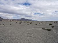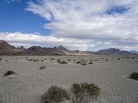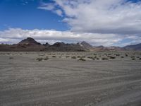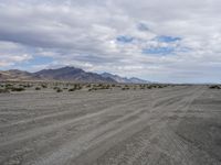A profile shot of a straight, long road winding through Utah's spectacular landscape of sand, dirt, gravel, rock, mud, mountains, and badlands. The horizon is lined with tall mountains and clouds, creating an impressive natural environment that stretches out into the distance.