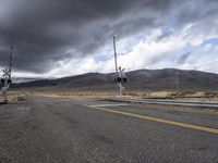 A vehicle travels straight down the highway with a winding road, railway, and Armco barriers cutting through the landscape of Utah's highlands, plains, and rural nature, on a winter day with a grey sky and overhead power lines.
