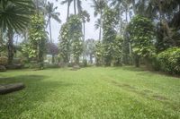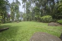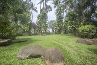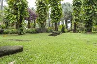 A lush green landscape of trees, plants and rock in a recreational botanical garden property on a foggy day.
