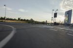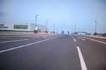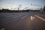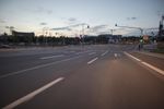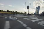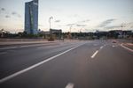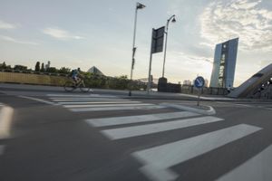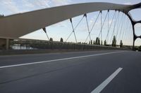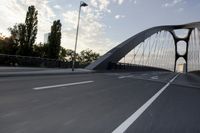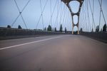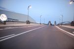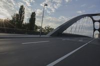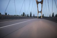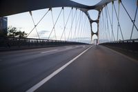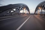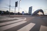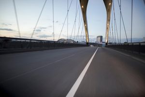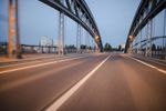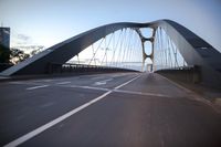 The dawn sky reflects in the asphalt of the city’s infrastructure as cyclists, pedestrians, and motor vehicles travel along the cable-stayed bridge, providing a stunning view of the metropolitan area of Frankfurt, Germany.