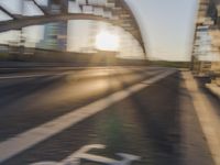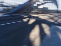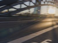 Sunlight hits a highway bridge in Frankfurt, Germany, with a backdrop of tints and shades of blue in the sky. The European city's infrastructure and modern automotive design are reflected in the water below. The reflections, shadows, and contrails create an atmosphere of motion and urban development.
