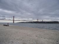 The gloomy grey sky and freezing water resources of Lisbon, Portugal, create an eerie landscape of cobblestone roads, bridges, and piers along the ocean's horizon.