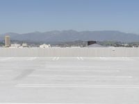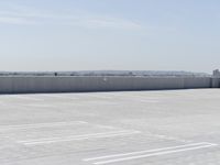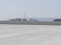 A view of a Brutalist architecture cityscape in the Arctic, with a corporate headquarters, high-rise buildings, skyscrapers, and a rooftop of a parking deck, as seen from a boat on a river in the early morning. The street is covered in snow and ice, with a frozen surface of asphalt, concrete, trees, and a boardwalk along the coastal shore.