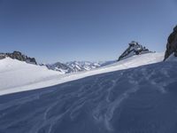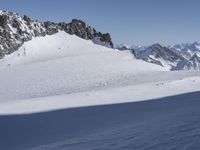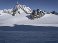 A mountain range with snow-covered peaks and glaciers, overlooks a clear blue sky in the winter over Europe. A tourist attraction with many recreation activities, such as skiing, Nunatak, and a massif, are visible from this terrain in Italy and France. The glacial, rock, and ice surfaces are throwing a hard shadow, with contrails and arête visible in the distance.