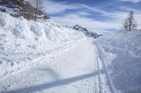 Early morning in the European Alps, Germany. A snow-covered off-road track takes the traveler between the majestic mountain landforms, glaciers, ice caps and nunataks. The stunning winter landscape is full of glacial arctic frost and freezing ice, while a ski-piste and a mountain range are visible in the horizon. A motion blur cloud gives the scene a sense of motion and adventure.