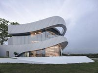 A modern residential villa with futuristic architecture in Hefei, China, surrounded by open grassy spaces and clear skies during the day.