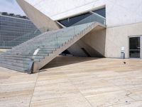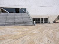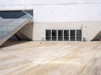 A composite material concrete bridge, fixed link and handrail is part of the modern architecture of Porto, Portugal. The Brutalist architecture of the building facade and structure is set against a clear sky, while the open space reveals a wood floor, tile flooring, asphalt, and a walkway with hardwood profile. Other features include a stair line, roof, wall, window, and paver road surface.