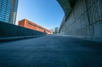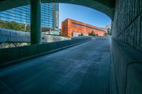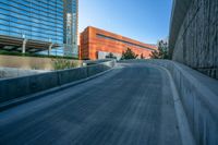 A modern office building and bridge stand tall against the clear sky, casting hard shadows on the asphalt road in the business district of Los Vegas, USA.