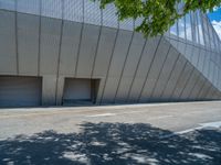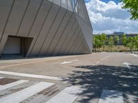 This stock photo showcases a futuristic architecture in Zaragoza, Spain. The modern concrete wall and road create a striking contrast against the clear blue sky. The hard shadows cast by the metal wall and the zebra crossing add depth to the composition. The urban setting and the unique design of the architecture make this location a must-visit for architecture enthusiasts. Capture the essence of contemporary design with this image.