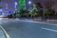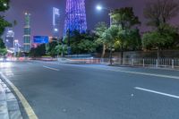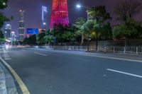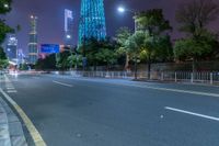 The vibrant and modern architecture of Guangzhou, Guangdong, China illuminated by artificial light on a dark night, with a road snaking through the cityscape.