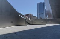 A modern urban landscape of concrete, asphalt, glass, steel, and walls in the metropolitan area of Los Angeles, California, USA, illuminated by the clear sky and hard shadows of the day.