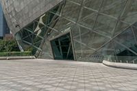 A one-quarter profile of the modern cityscape of Guangzhou, China, featuring glass walls and futuristic architecture against a clear sky. Urban surfaces of concrete and glass pavers create an open, urban space.