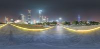 Viewed from straight down the road, the open space of Guangzhou, China is illuminated by artificial light creating a modern and urban cityscape with a museum, music hall and futuristic architecture.