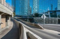 A stunning view of a modern office building and bridge in the bustling city of Los Vegas, USA. The clear sky and low angle of the sun cast a hard shadow, creating a dramatic effect on the futuristic architecture. The urban design of the business district is truly remarkable.
