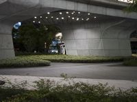 A nighttime view of a futuristic urban landscape in Soho, Shanghai, China. The scene includes an office building, a bridge, a plaza, a walkway, a road surface, and a residential area with trees and grass, all illuminated with artificial light.