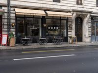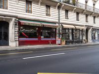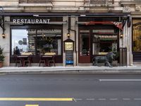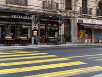 The classic architecture of Geneva, Switzerland, is on full display in this urban residential area. A crosswalk allows people to safely traverse the city streets, as a restaurant offers a chance to eat out in the heart of Europe's city life.