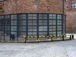 A residential area in Germany is filled with classic brick architecture, cobble stone courtyards, and an urban design of trees, grass, and open spaces. The area is filled with tints and shades of sunlight, creating a composite material of lines, rectangles, and curves. The city life of metropolitan Germany is encapsulated in the view of this neighborhood.