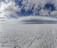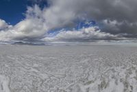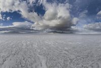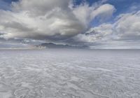 A dramatic landscape of salt, sand, and sea stretches towards a distant horizon of snow-capped mountains in the wintery atmosphere of Salt Lake City, Utah, USA. The cumulus cloud and sunshine add to the natural environment of this polar ice cap, creating a peaceful and open space to explore.