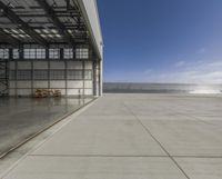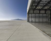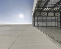 The sun shines through a window in a concrete hangar at Los Angeles International Airport in California, USA. The open space of the hangar reveals a clear sky, a blastwall, and a road surface beyond, while the flooring and roof provide an interesting contrast.