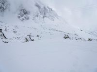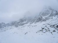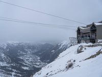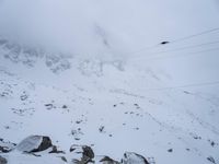 The Mont Blanc massif in the French Alps, Europe, is a foggy and gloomy sight on this winter day. A gondola takes passengers to the summit of the Aiguille du Midi, with its snowy landscape and open space highlighted against the grey sky. A single footprint in the snow testifies to the majesty of nature's surface.