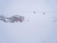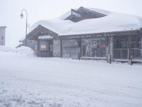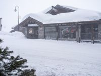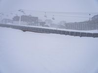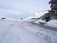 A winter blizzard creates a hazy glacial landscape in the French Alps, with a residential neighborhood, buildings, and a vehicle driving straight down the road in the icy cold.