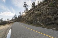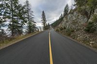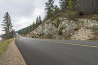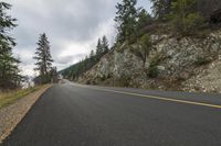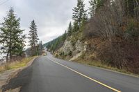 A grey sky looms over a gloomy landscape in West Kelowna, British Columbia, Canada. The straight road leads through the highlands, with mountains in the distance. The asphalt road surface contrasts with the lush vegetation and rock walls along the way. The Okanagan Valley and Okanagan Lake can be seen in the background, surrounded by trees and grassy slopes. The coastal area is visible, with water stretching out into the ocean or lake. A lone tree branch adds a touch of natural beauty to the scene.