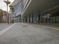 A view of a gloomy metropolitan area at dawn, showing tall office buildings and a road lined with trees and vegetation.