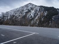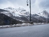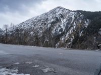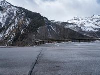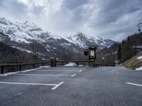 A wet and gloomy winter in the French Alps, with a winding road, mountains, and open parking lot, all under a grey sky, seen from a rural landscape.