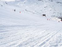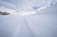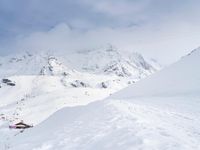 A low landscape of mountains, snow, and clouds in the French Alps creates a gloomy yet beautiful view for tourists in the winter. Ski tracks and a clear sky provide an overlook of a valley and a nature surface for winter tourism.