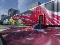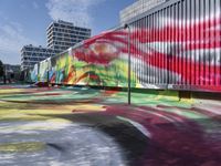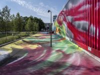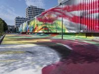 Berlin, Germany is a vibrant city full of modern architecture, graffiti walls, street art, urban design, and visual arts. The streets are lined with yellow facades, asphalt roads, trees, and water. A warehouse, gallery, and courtyard are visible with multicolored paintings, murals, and watercolor art. The city is alive with technology, transport, elevated structures, stadiums, and public spaces. The clear sky reveals the city's high-rise buildings, grassy landscapes, and colorful vegetation, all illuminated by the sun's light and reflection.