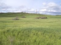 A lush and open grassland pasture in the natural environment of California, USA, illuminated by the day's sun and surrounded by clouds.