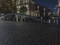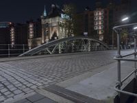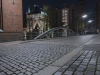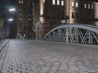 The classic architecture of the Speicherstadt district in Hamburg, Germany is showcased in this alley-way, illuminated by artificial light. The cobble stone flooring is lined with balusters, handrails and guard rails, while the brickwork, steel and iron of the buildings and bridges create a unique urban design.