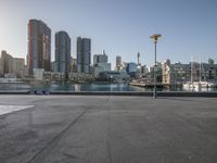 A beautiful sunny morning at the Harbourside Sealed Promenade, with a stunning view of the city skyline and clear blue sky reflecting on the calm river. The modern architecture and high-rise buildings create a perfect urban landscape, while the road surface and street lights enhance the city life. The open space and nature, including the ocean and boat, add a touch of tranquility to this vibrant coastal city scene.